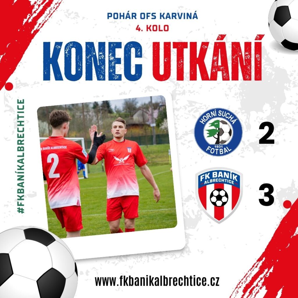 Včera, ve středu 8. dubna, sehrál tým trenéra Lukáše Hawlaska 4. kolo okresního poháru OFS Karviná proti Horní Suché. I když byl tým Horní Suché veden jako domácí, hrálo se u nás na vedlejším hřišti. Baník toto utkání zvládl a zvítězil výsledkem 3:2, když poločasové skóre bylo 3:1. Vítězství tedy znamená, že již počtvrté během pěti let budeme hrát finále okresního poháru OFS Karviná. Finále se bude hrát v našem areálu 22. dubna od 17:00. Soupeřem našich hráčů bude tým FK Slavia Orlová.